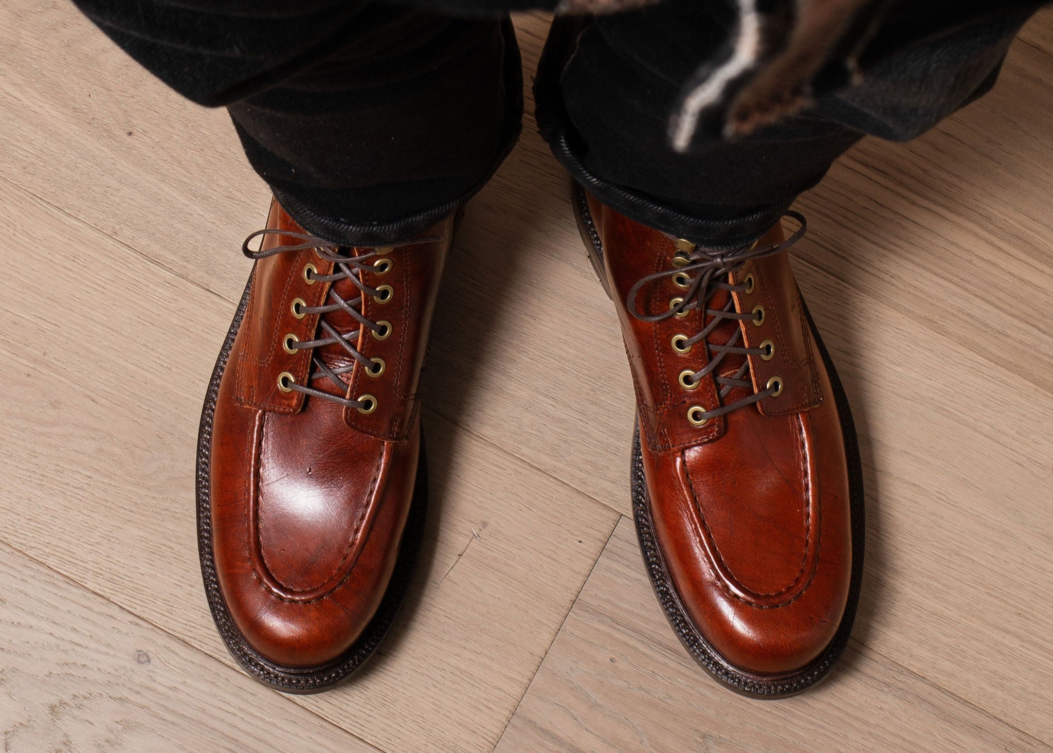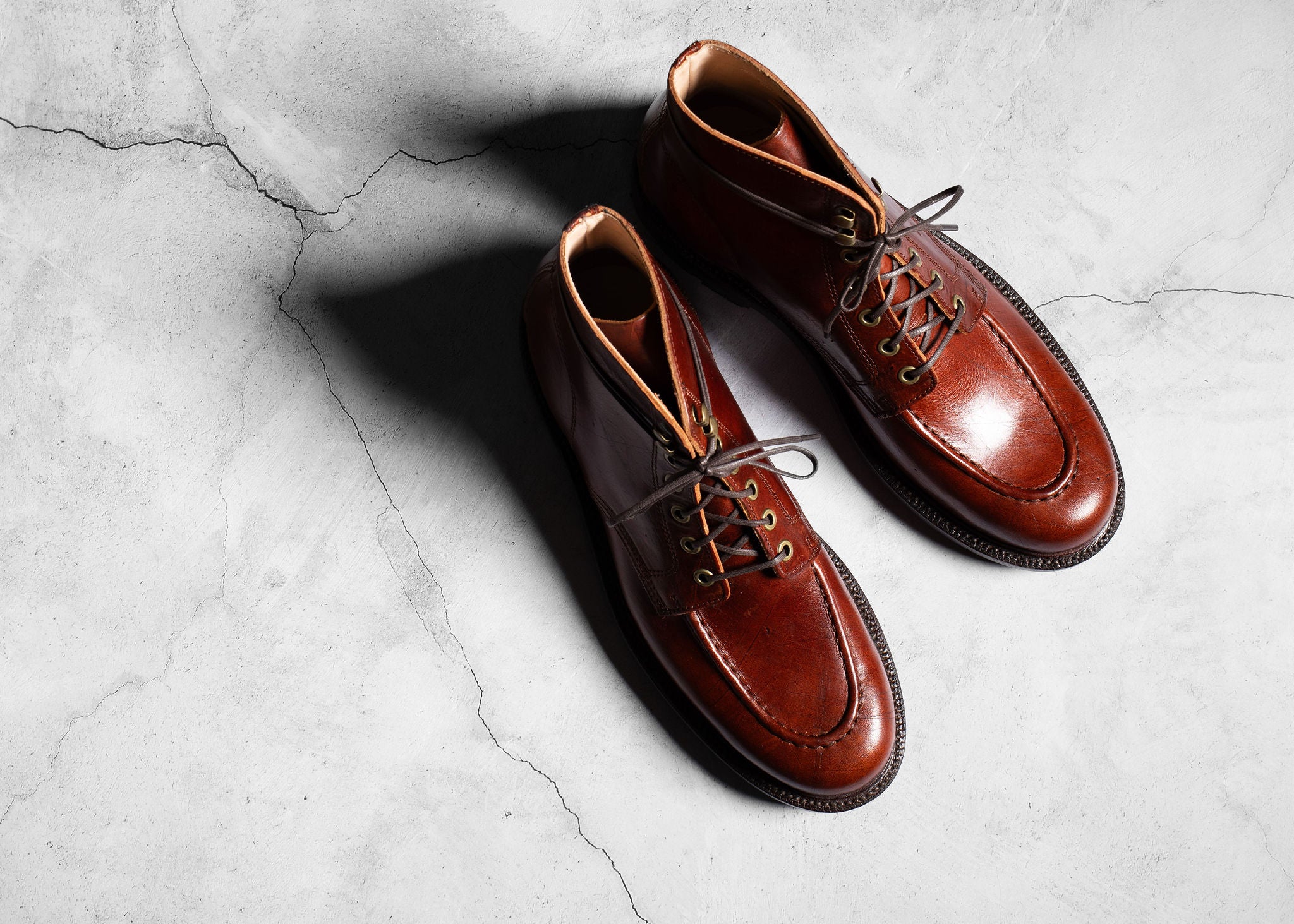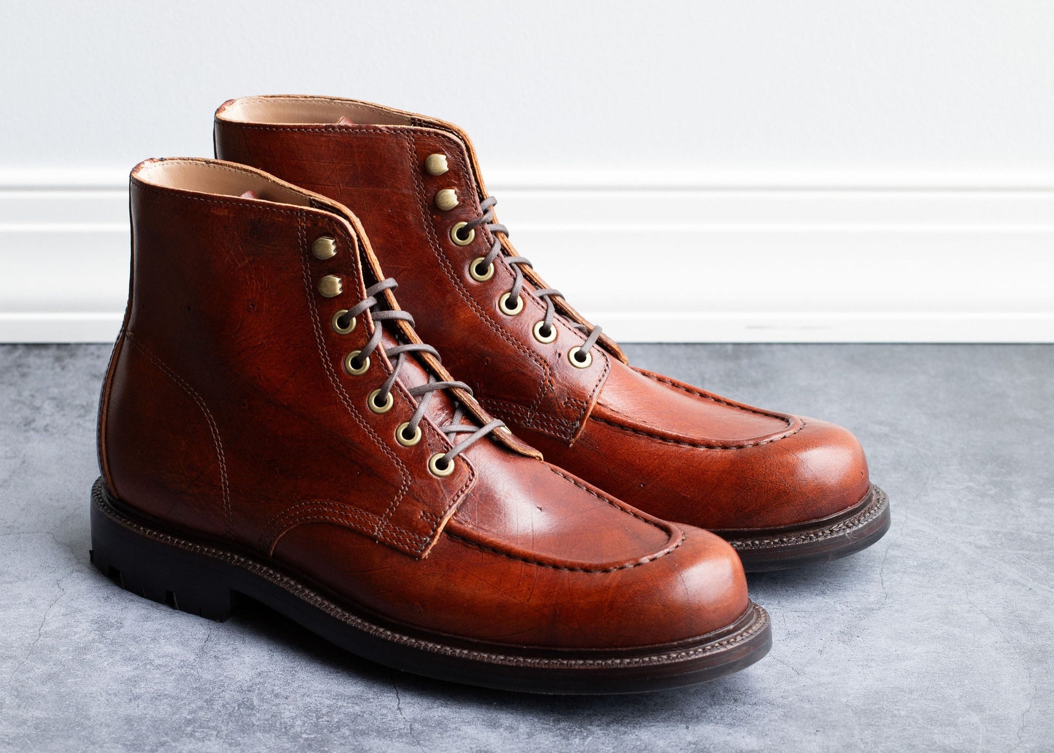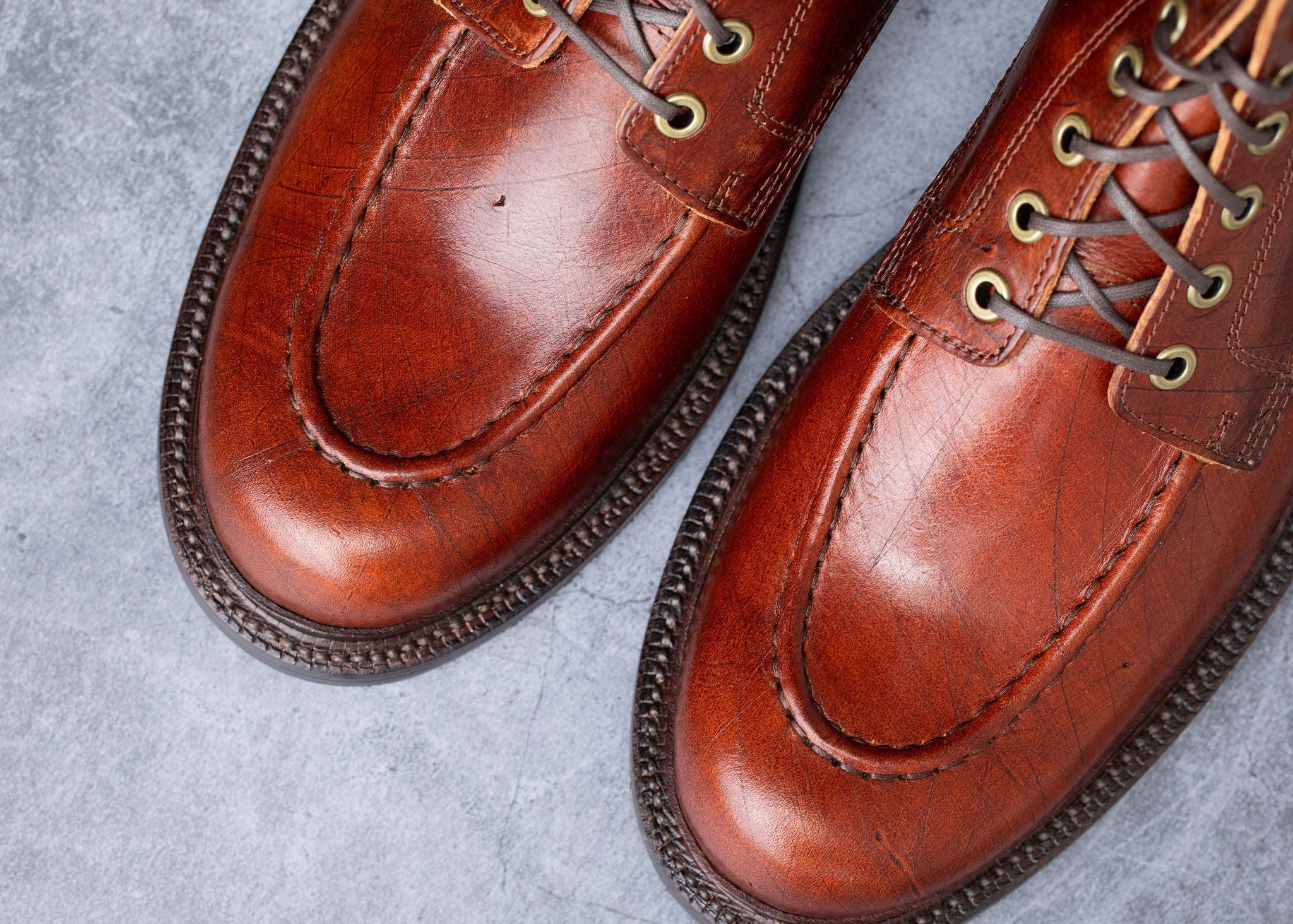 The Brass Boot combines robust leathers, rugged outsoles, and all-day comfort. The moc toe is hand-sewn onto a one-piece vamp. The Floyd last features the same locked-in heel control but with higher walls at the toe box to allow forefoot freedom.