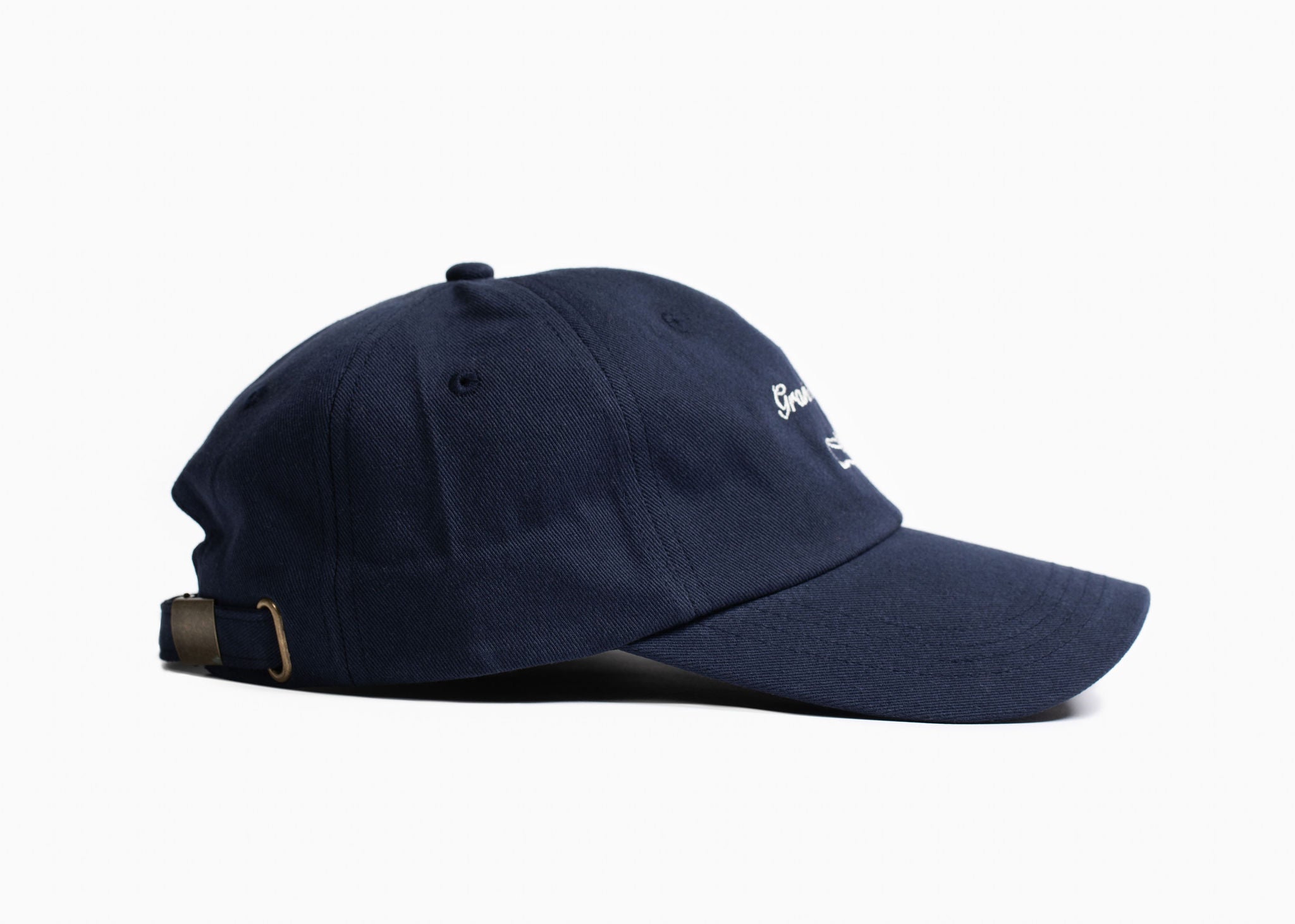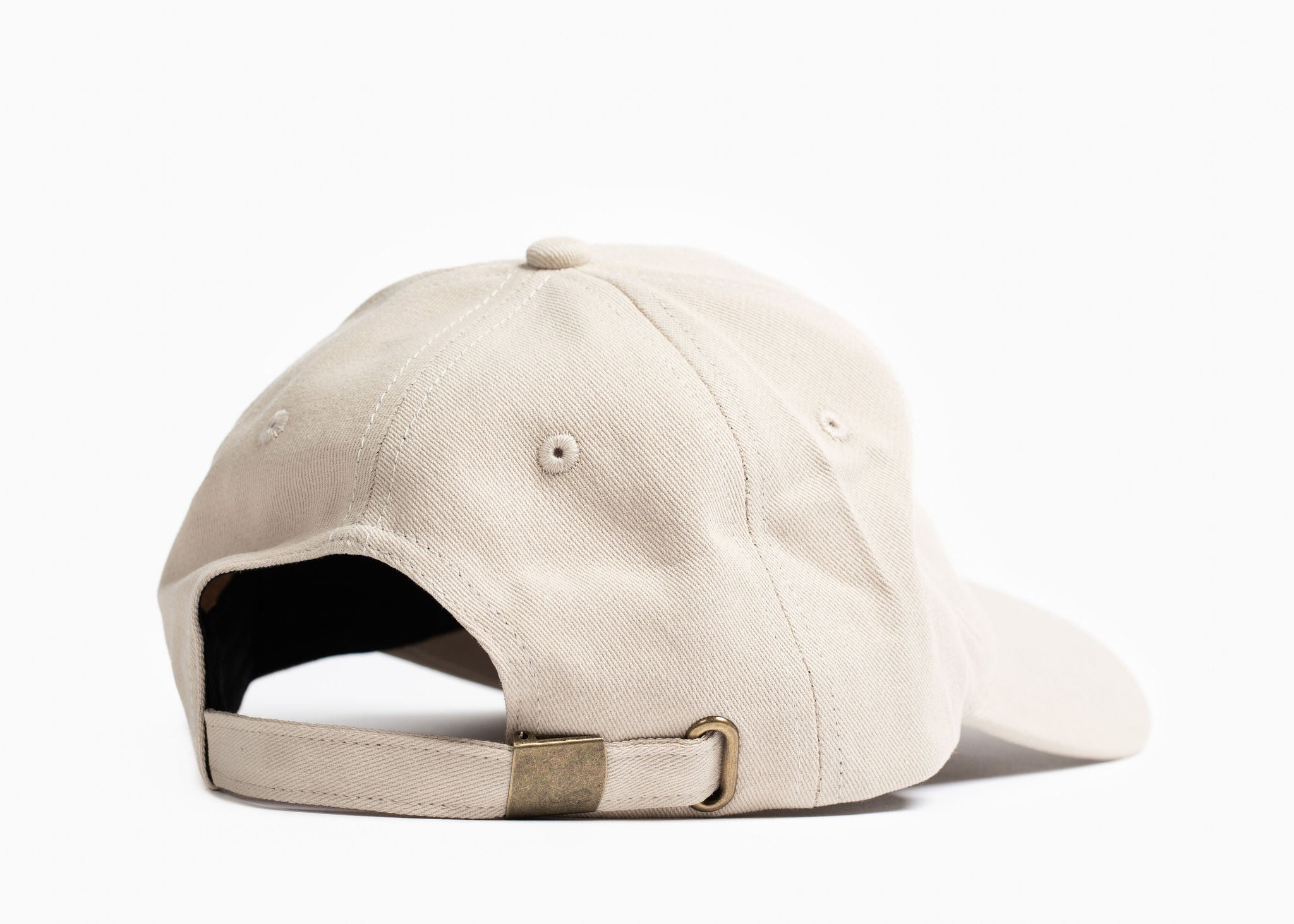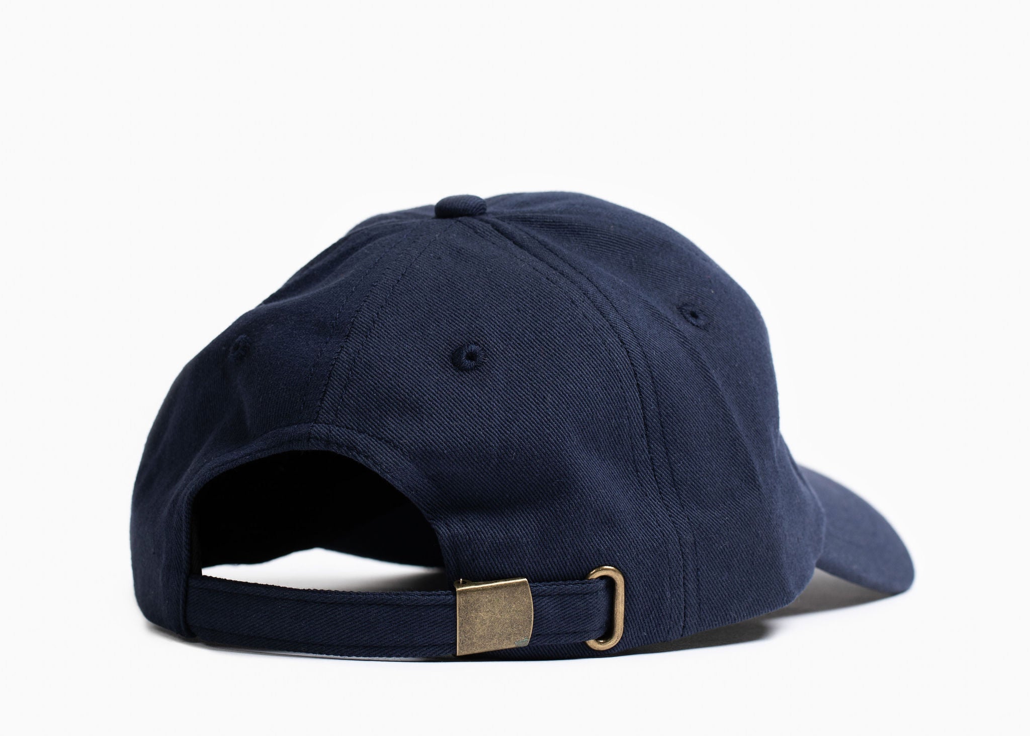 This hat is made to our specs in 100% cotton. The low-profile crown is unstructured, allowing it to settle over time. It utilizes a belt buckle closure with an area to tuck in the strap.