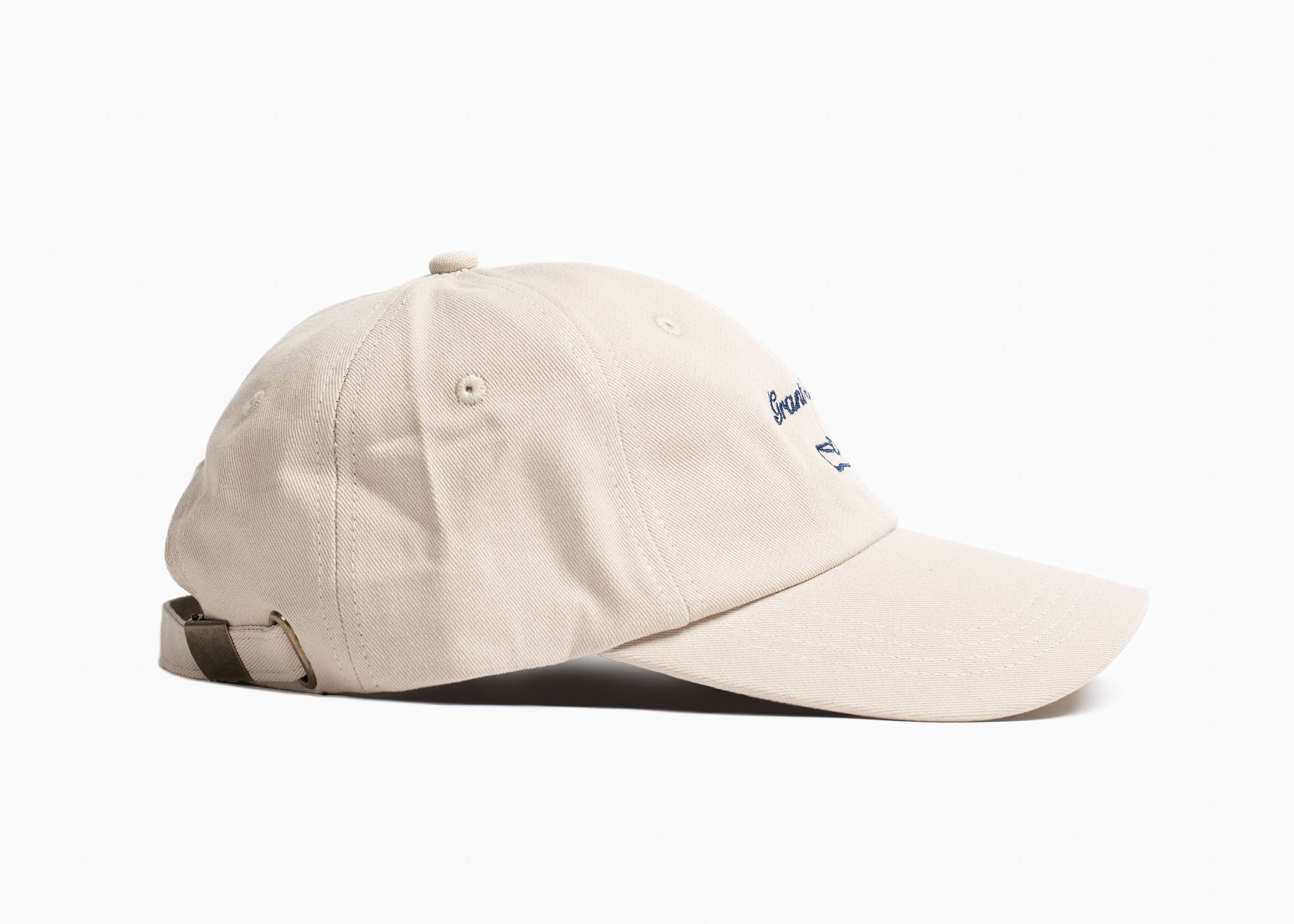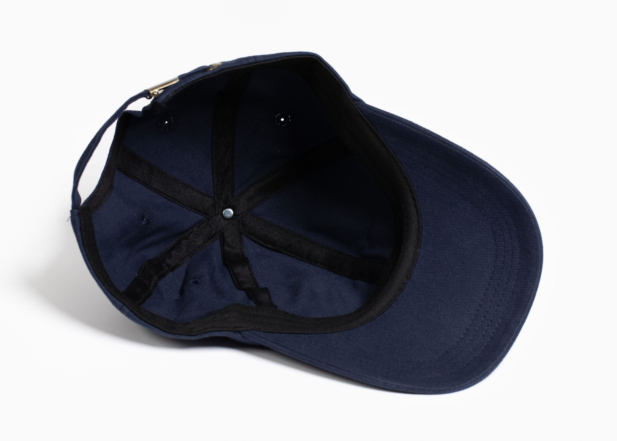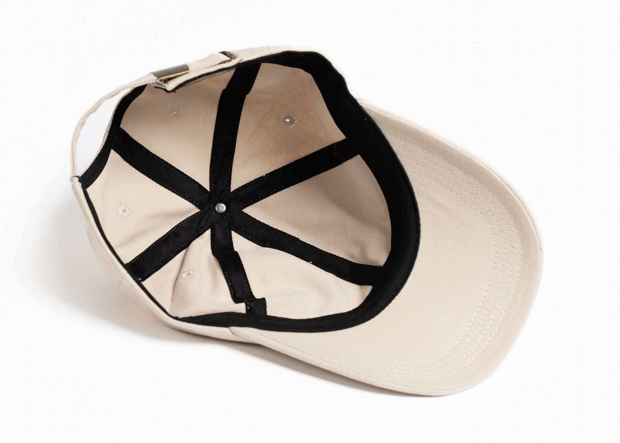 This hat is made to our specs in 100% cotton. The low-profile crown is unstructured, allowing it to settle over time. It utilizes a belt buckle closure with an area to tuck in the strap.