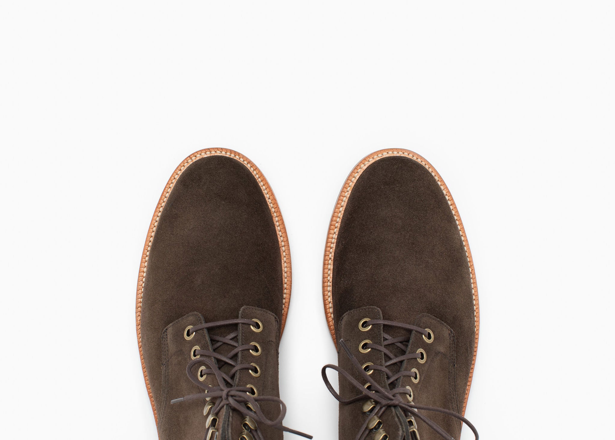 What exactly is loden? The color's name comes from the German Loden, a course thick woolen fabric. While in the original German, Loden does not necessarily refer to a color, due to the wool of the mountain sheep, the color tends to be an earth color—somewhere between green and brown. The Loden suede paired with dark chocolate welts and edge stain makes for a sharp, plain-toe boot. The dark Loden suede combined with natural welts and edge stain offers contrast without being too loud. The brass eyelets complement the two colors, pairing nicely with the welt.